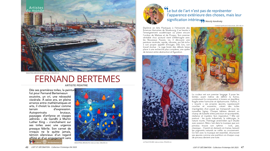 Fernand Bertemes, artiste de renom, né en 1964 à Esch-sur-Alzette (Luxembourg) dans une famille d’ouvriers et de fermiers. Passionné de peinture depuis son plus jeune âge, il est devenu un artiste figuratif avec une approche vigoureuse de la couleur. Après des études d’art à Strasbourg et avoir vécu à Berlin et New York, il se consacre entièrement à la peinture et installe son atelier près de Paris.